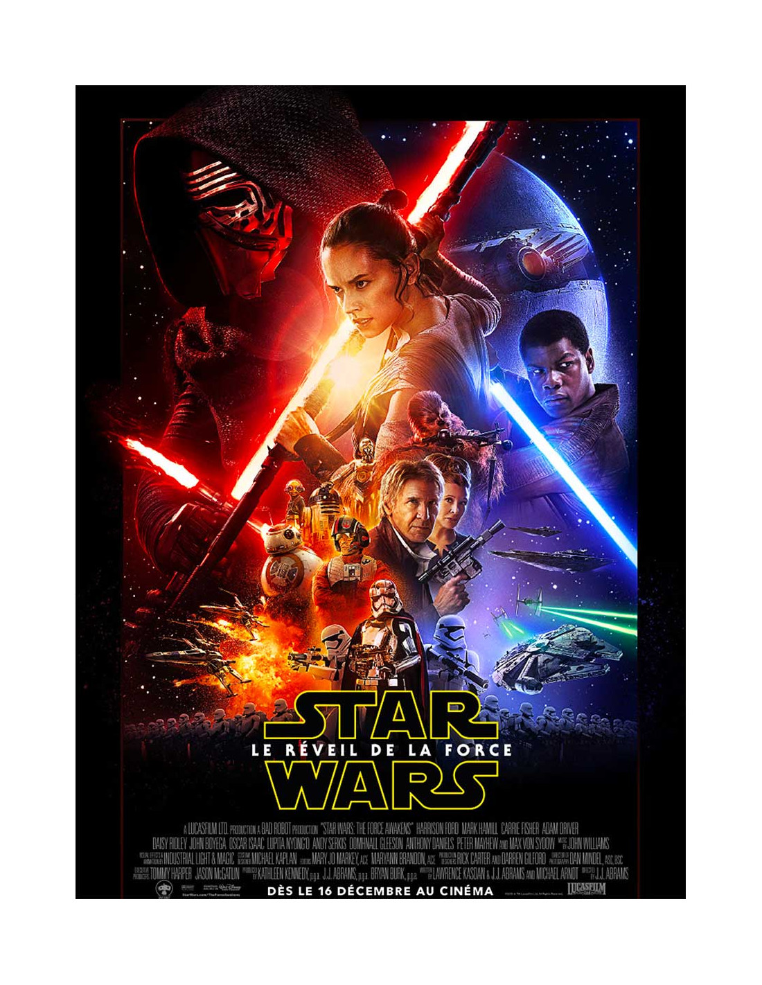 L'affiche qui a annoncé le grand retour de la saga la plus culte du cinéma mondial. Affiche originale de Star Wars : Episode VII — Le Réveil de la Force, film de science-fiction et d'aventure sorti le 16 décembre 2015 en France, réalisé par J.J. Abrams avec Daisy Ridley (Rey), John Boyega (Finn), Harrison Ford (Han Solo) et Adam Driver (Kylo Ren). Format 40x53 cm environ, conditionnée roulée, en très bon état. Affiche de distribution française, éditée pour la sortie nationale du film — elle arbore la composition iconique rassemblant les personnages de la nouvelle et de l'ancienne génération, à l'exception notable de Luke Skywalker, absent volontaire de la campagne d'affichage officielle.