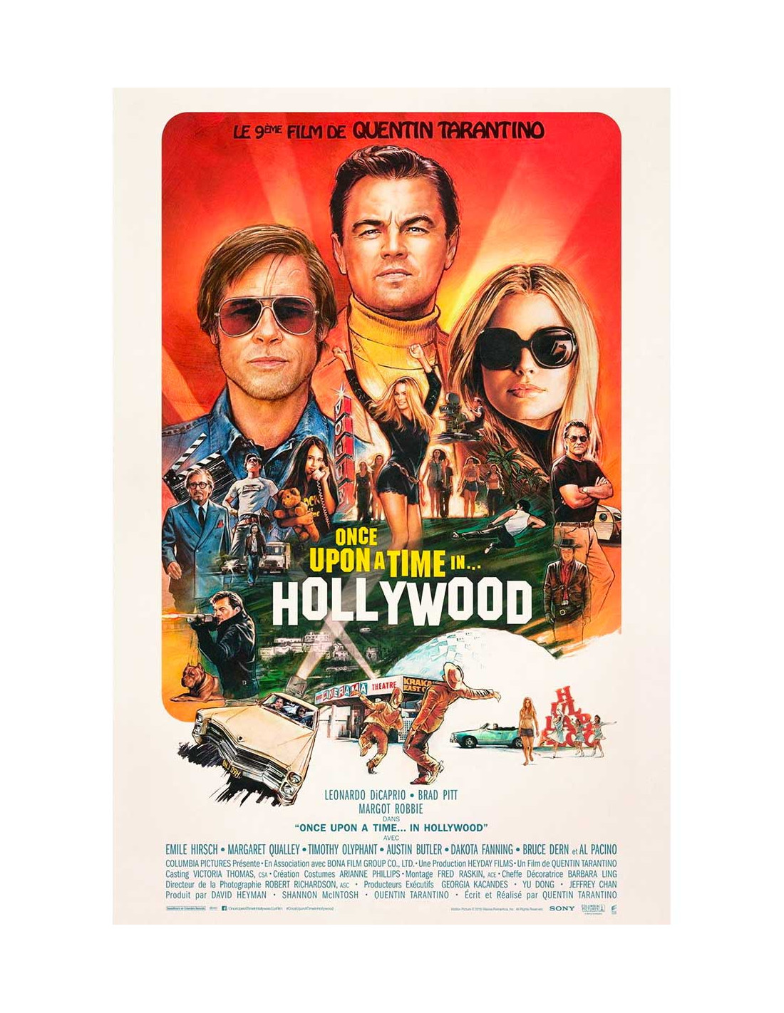 Neuvième long-métrage de Quentin Tarantino, présenté en compétition officielle au Festival de Cannes 2019, le film a réuni une distribution d'exception — DiCaprio, Pitt, Margot Robbie, Al Pacino — et remporté deux Oscars. Une affiche très recherchée par les collectionneurs, portée par l'aura mondiale d'un film déjà entré dans la légende du cinéma contemporain.