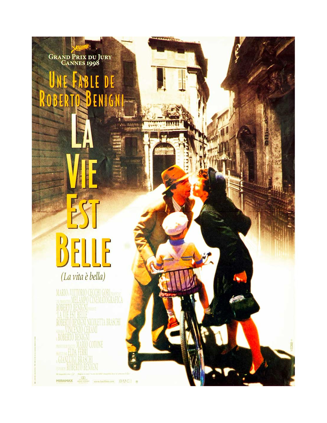 Affiche originale française de La Vie est Belle (La vita è bella), comédie dramatique italienne de 1998 réalisée et interprétée par Roberto Benigni, avec Nicoletta Braschi et Giorgio Cantarini.