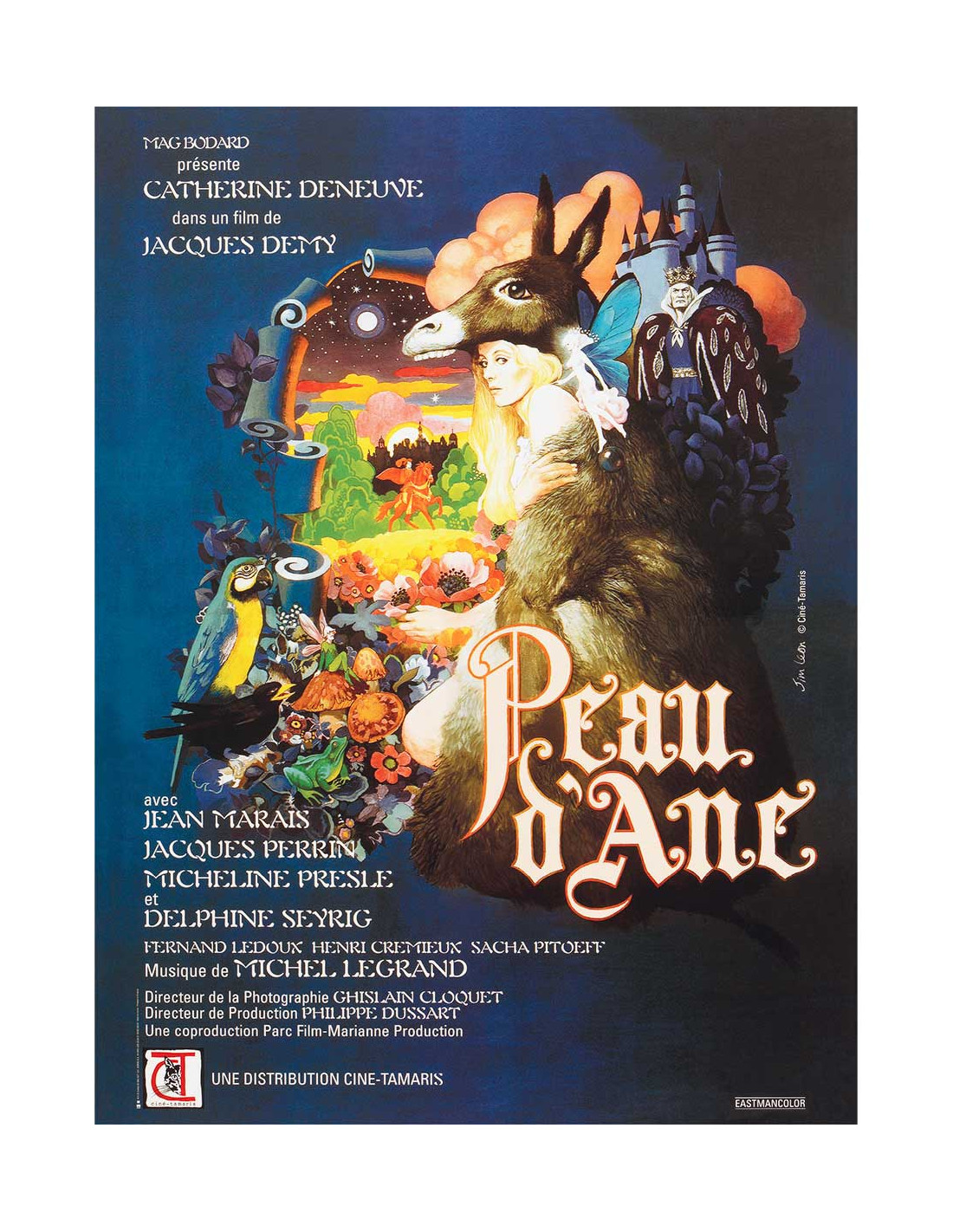 Affiche originale de ressortie de Peau d'Âne, comédie musicale et fantastique de 1970 réalisée par Jacques Demy, avec Catherine Deneuve, Jean Marais, Delphine Seyrig et Jacques Perrin. Format 40×53 cm, conditionnement roulé, état très bon — sans pli, proche du neuf. L'affiche française se distingue par le choix iconique de la peau d'âne comme visuel central, là où les affiches internationales mettaient en avant les robes somptueuses du film. L'illustration psychédélique signée Jim Léon, fidèle à l'esthétique pop et onirique du film, en fait un objet visuellement saisissant.