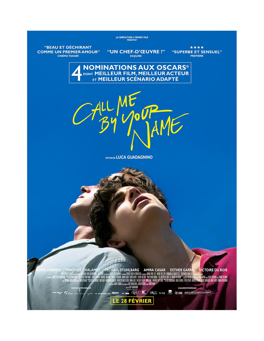 Palme d'Or du public et Oscar du Meilleur scénario adapté en 2018, Call Me by Your Name est devenu un objet de culte cinéphile en quelques années à peine — sa révélation mondiale, Timothée Chalamet, propulsé au rang de star internationale. Une pièce recherchée, au tirage limité, dont la cote ne cesse de progresser auprès des collectionneurs de cinéma d'auteur et de coming-of-age films.