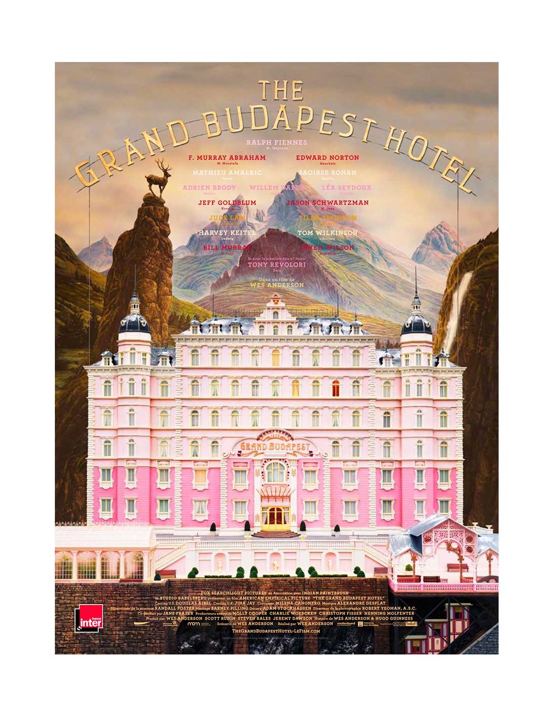 Un bijou d'orfèvrerie cinématographique, encadrable dès la première vue. Affiche originale française de The Grand Budapest Hotel, comédie dramatique de 2014 co-écrite et réalisée par Wes Anderson, inspirée des écrits de l'auteur viennois Stefan Zweig. Format 40×53 cm, conditionnement roulée, état très bon. Le film met en scène Ralph Fiennes dans le rôle de M. Gustave, légendaire concierge de l'hôtel Grand Budapest, aux côtés d'un casting exceptionnel comprenant notamment Tony Revolori, Tilda Swinton, Bill Murray, Adrien Brody et Saoirse Ronan. L'affiche reflète l'univers visuel si particulier du film, avec sa palette rose et ses compositions symétriques caractéristiques du style Wes Anderson.