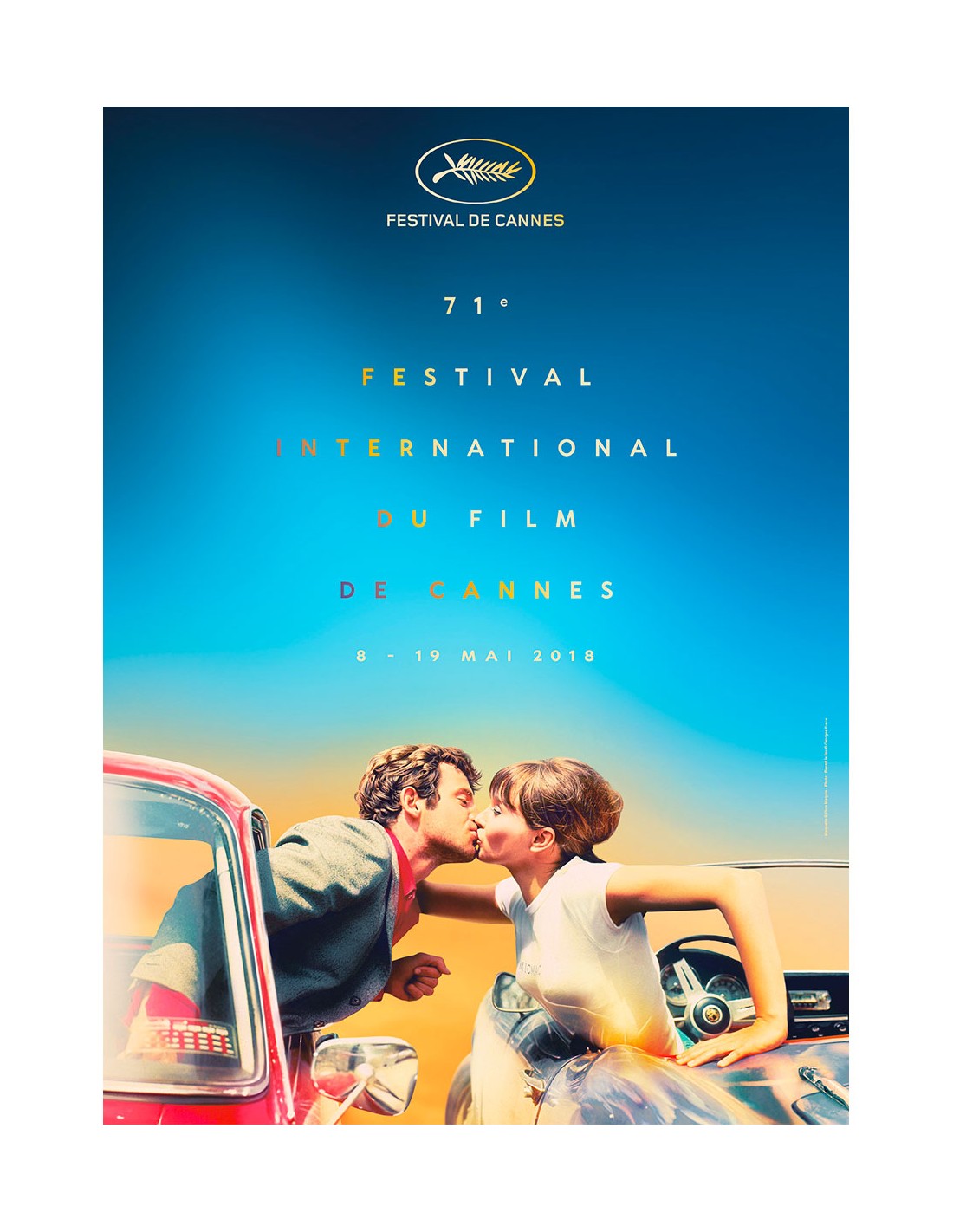 Un baiser volé, une cabriolet rouge, et la Nouvelle Vague en pleine lumière : l'affiche du 71e Festival de Cannes est une déclaration d'amour au cinéma français. Affiche officielle originale du Festival de Cannes 2018, dont le visuel est tiré d'une photographie de plateau de Georges Pierre (1927–2003), prise durant le tournage de Pierrot le fou (1965) de Jean-Luc Godard, avec Jean-Paul Belmondo et Anna Karina. La maquette graphique est signée Flore Maquin, illustratrice inspirée de la pop culture, qui mêle dessin, peinture et art numérique dans une composition vibrante et colorée.