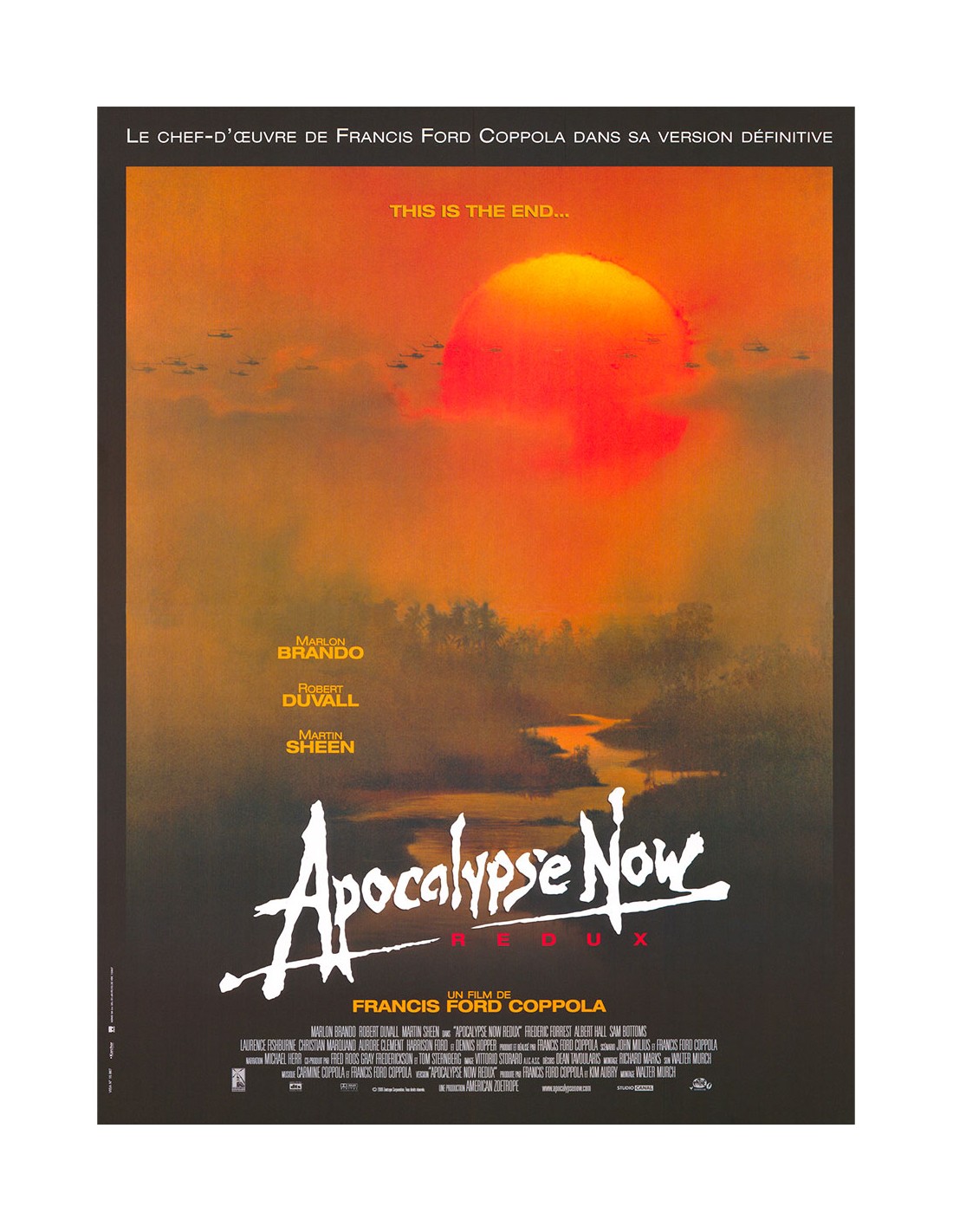 Un monument du cinéma américain dans son édition Redux, telle qu'elle fut distribuée en salles en 2001. Affiche originale de Apocalypse Now Redux, film de guerre et de guerre psychologique réalisé par Francis Ford Coppola, ressortie en 2001 avec 49 minutes de séquences inédites par rapport à la version originale de 1979. Format 40x53 cm environ, conditionnement roulé, état neuf. Affiche française de la ressortie Redux, présentant le visuel emblématique du film — le visage émergent de Martin Sheen dans les eaux sombres, dominé par la présence fantomatique de Marlon Brando dans la peau du colonel Kurtz. Pièce de choix pour tout amateur de cinéma américain des années 1970 et de l'œuvre de Coppola : Apocalypse Nowfigure parmi les plus grands films de tous les temps et a été sélectionné par le National Film Registry pour son importance culturelle et historique. L'affiche Redux est aujourd'hui moins courante que celle de la version originale de 1979, ce qui en fait un document recherché par les collectionneurs.
